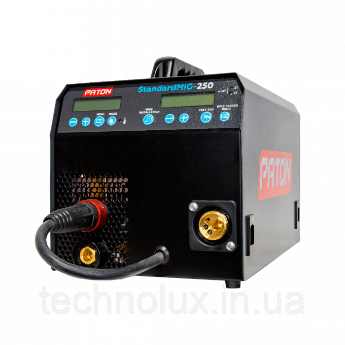 Цифровий інверторний напівавтомат PATON StandardMIG-250 – це апарат однокорпусного типу виконання, призначений для напівавтоматичного зварювання (НА «MIG/MAG»), ручного дугового зварювання (РДС «MMA»), аргонодугового зварювання (АРГ «TIG») постійним струмом в середовищі захисних газів і сумішей. В апараті StandardMIG-250 реалізований повністю цифровий спосіб управління, за рахунок чого забезпечуються його багатофункціональність і широкі можливості в точному налаштуванні режимів зварювання. Номінальний струм до 250А дає можливість працювати будь-якими електродами діаметром від 1,6 мм до 6 мм (легкоплавкі) і суцільним зварювальним дротом діаметром від 0,6 мм до 1,2 мм. Окремий закритий відсік для зварювального дроту підвищує його захист від пилу та інших забруднень.